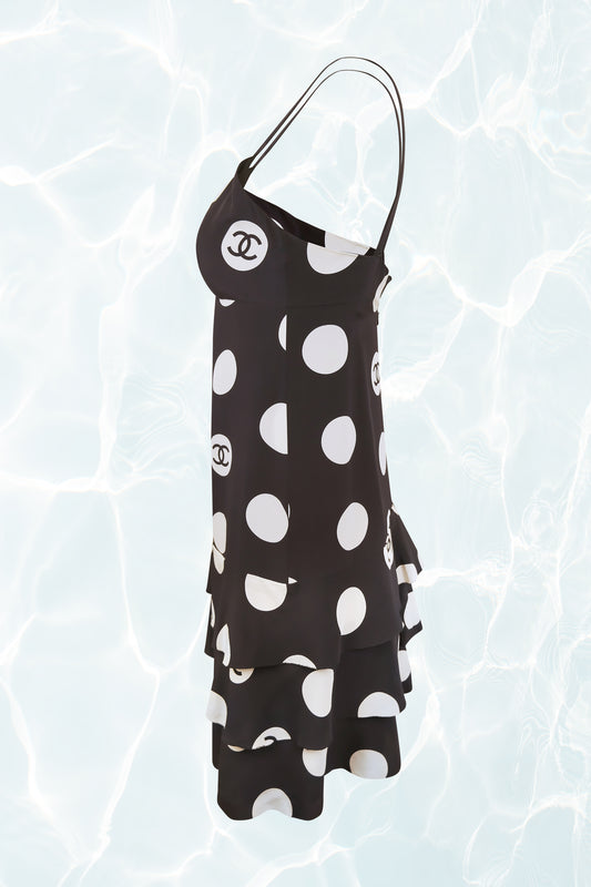 Vintage SS 1997 Runway Black and White Tiered Silk Polka Dot Tank Dress