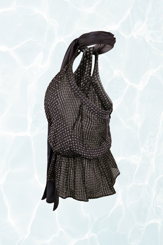 Polka Dot Silk Chiffon Open Back Halter Top with Scarf Tie