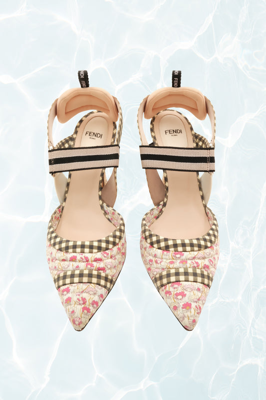 Gingham and Floral Colibri Cloth Slingback Pumps