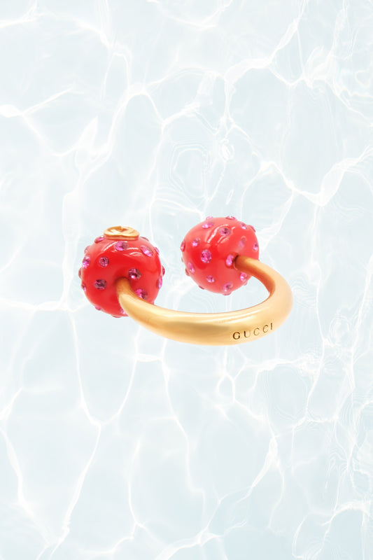 GG Logo Cherry Ring Gold and Enamel with Pink Crystals