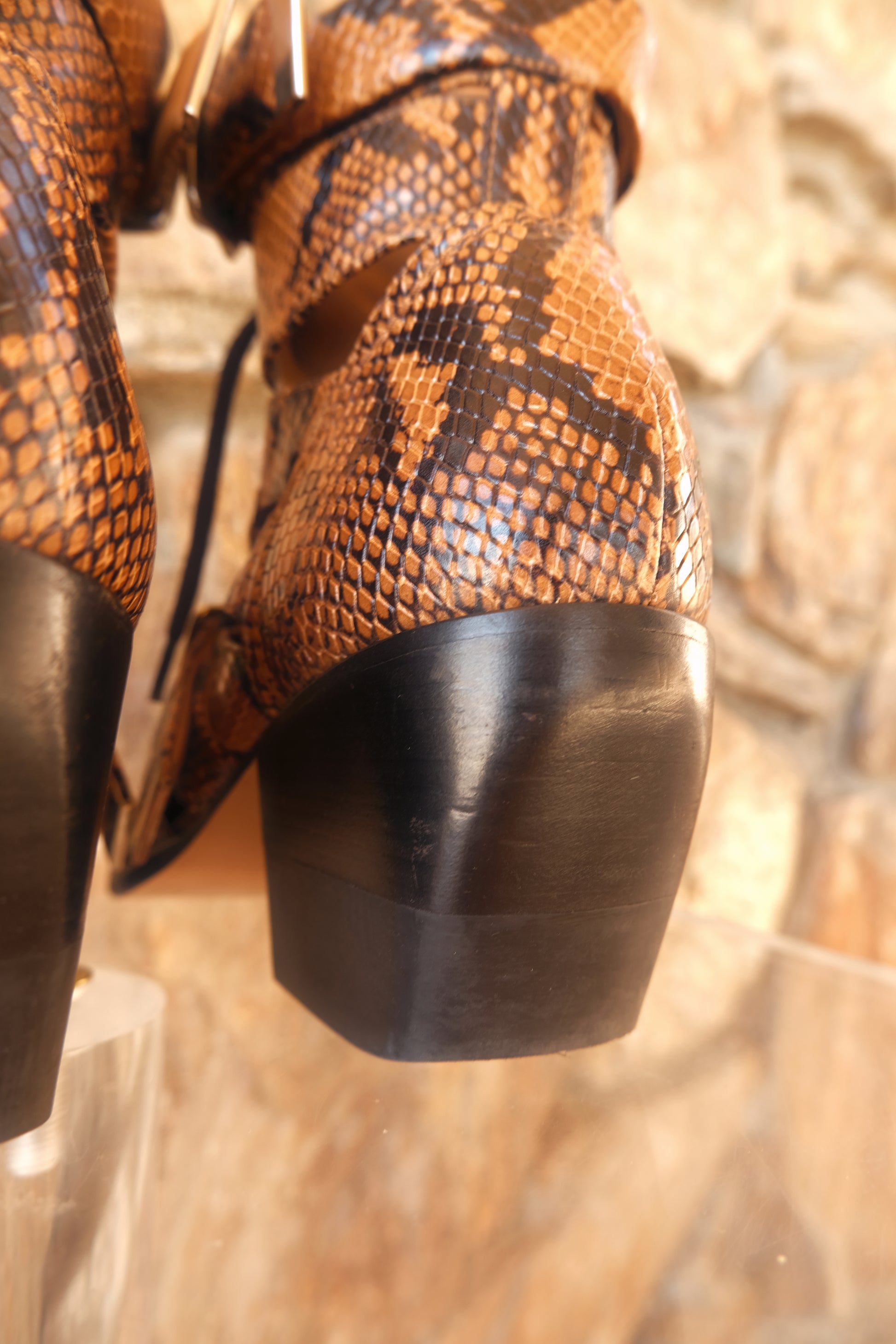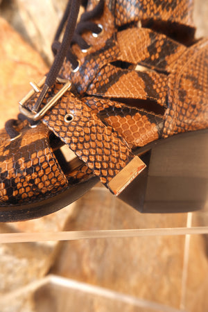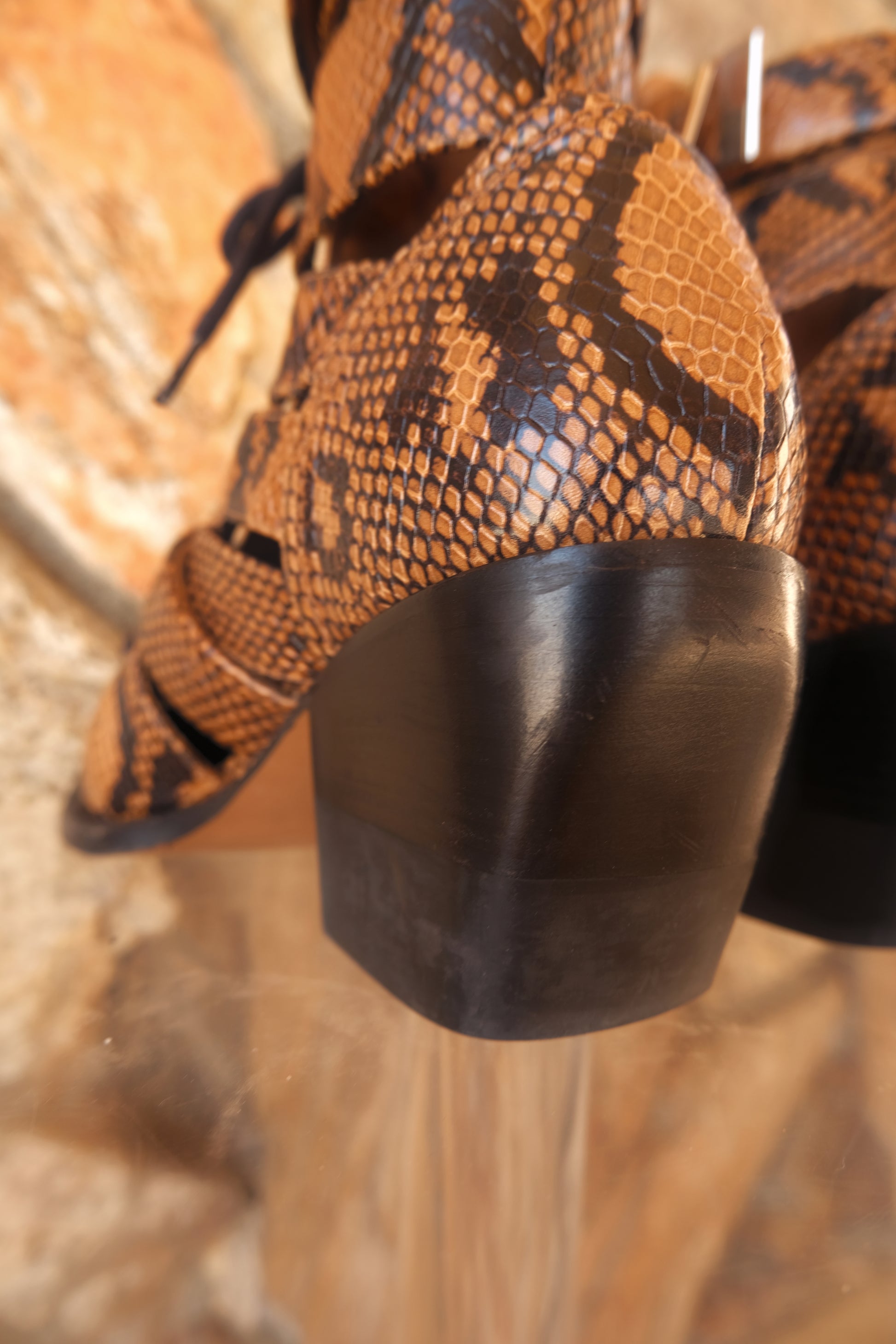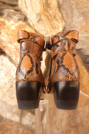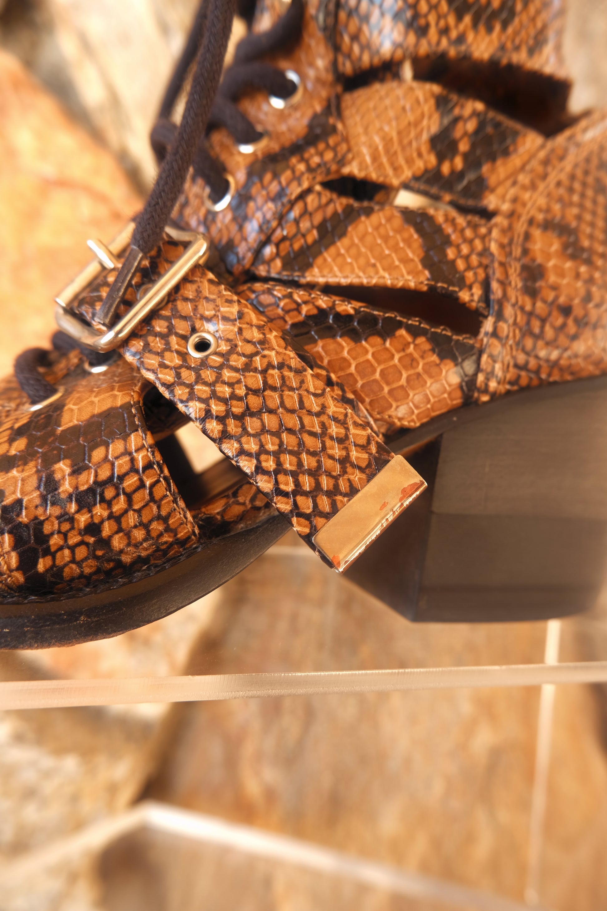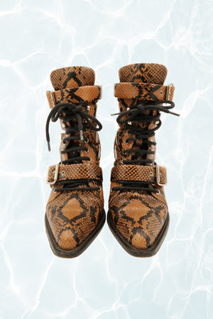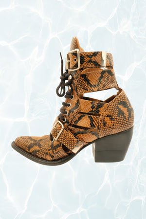 Chloe Rylee python print calfskin ankle boots in brown. Features a lace up design and two straps with silver hardware, upper cutouts, padded tongue, western style heel, and pointed toes.